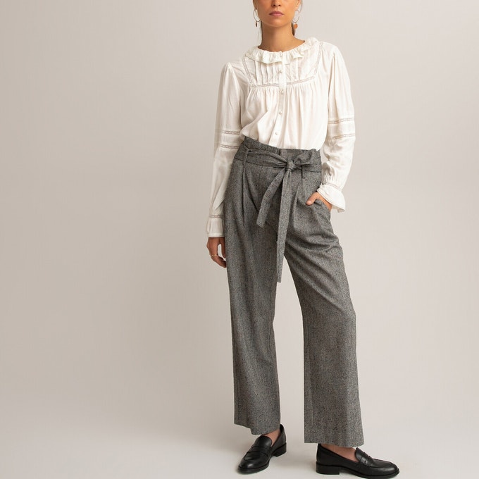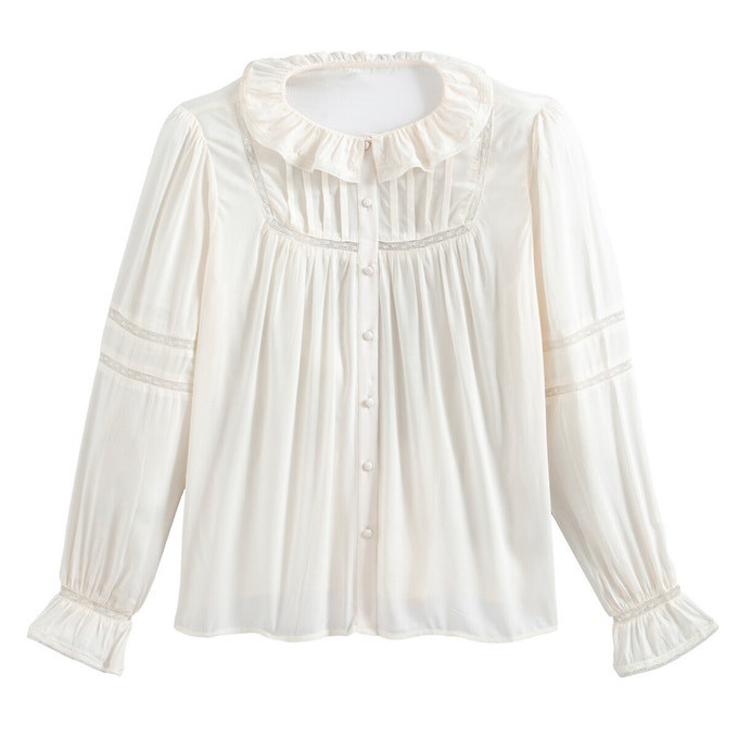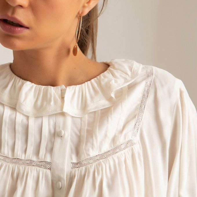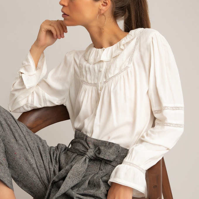 Ce chemisier insufflera une touche de romantisme à vos tenues. Il se distingue par son col rond volanté, ses manches bouffantes et ses délicats détails en dentelle. On aime son style bohème chic. Associez-le à un jean ou un pantalon de tailleur.
